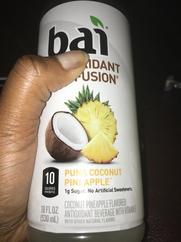 Bai Antioxidant Beverage, Puna Coconut Pineapple Coconut pineapple flavored antioxidant beverage with vitamin E. With other natural flavors. 10 calories per bottle. 1 g sugar. 2 net carbs per serving (Erythritol carbs have no calories or effect on blood sugar). Antioxidants (per bottle): 3.0 mg Vitamin E; 50 mg Polyphenols from green coffee bean and coffeefruit extracts. Gluten free. Good source of Vitamin E. 55 mg Caffeine per Bottle: Like ... Keurig Dr Pepper Product Facts The Keurig Dr Pepper product facts website provides the latest nutrition and ingredient information so you can make informed choices. ... Bai Antioxidant Cocofusion Puna Coconut Pineapple. Size: 18 fl oz: Calories: 10: Total Fat: 0 g: Sodium: 65 mg: Carbs: ... Bai Boost Cartago Pineapple Passion Fruit Caffeinated Water Beverage. Size: 18 fl oz ...