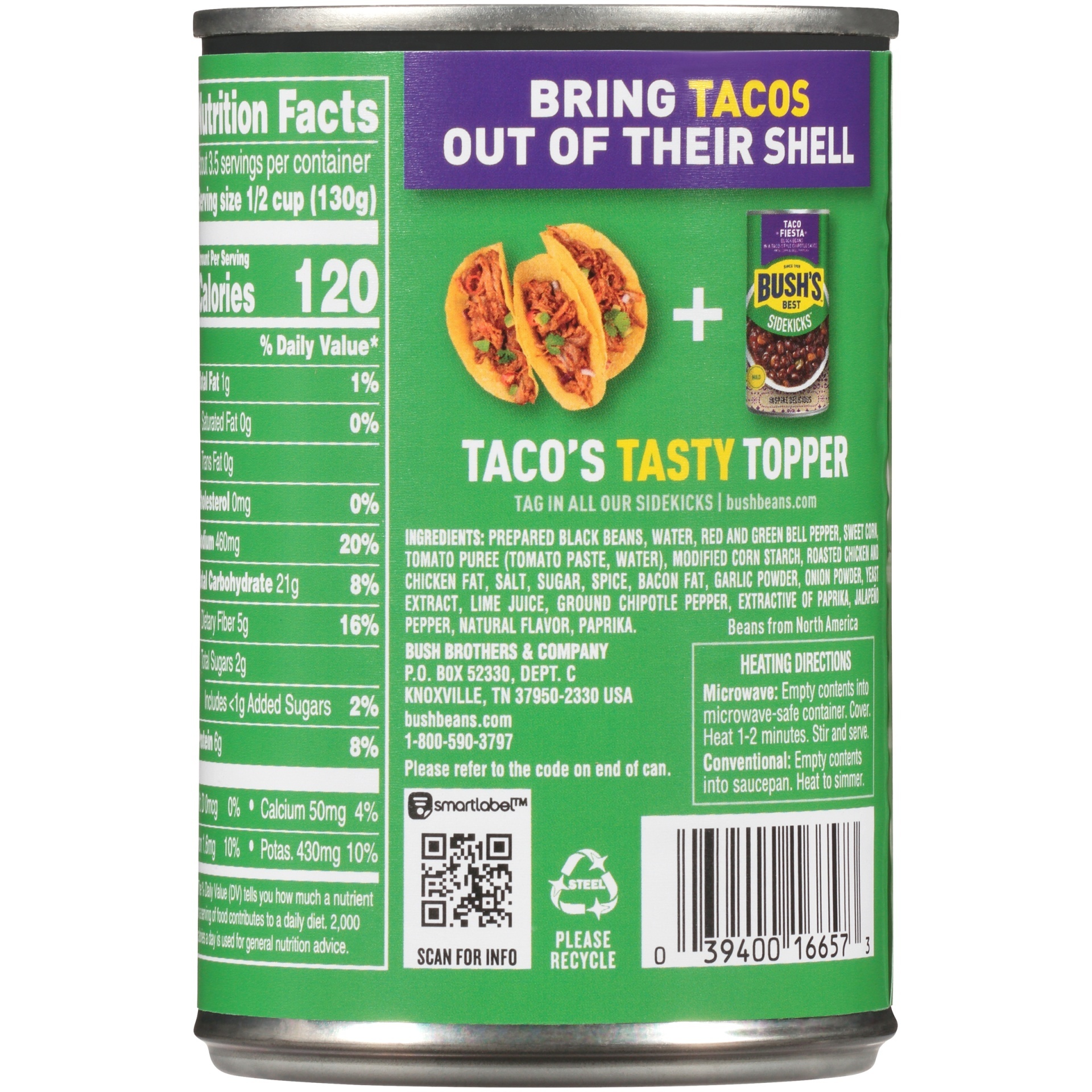 Bush's Best Black Bean Fiesta - Shop Canned & Dried Food at H-E-B Shop Bush's Best Black Bean Fiesta - compare prices, see product info & reviews, add to shopping list, or find in store. Select locations now offer curbside pickup & home delivery ... Nutrition Facts. Black Bean Fiesta. 3.5 Serving Per Container. Serving Size: 0.50 cup(130g) Amount Per Serving. Calories: 120: Calories from Fat: 0 % Daily Value* FAQ | BUSH'S® Beans The menu features deli sandwiches, salads, hamburgers and hot dogs, a daily special, vegetables, beans, homemade desserts and an ice cream shop. For hours, please see our Visitor's Center page. If you need more information please call (865)-509-3077 or find directions here.