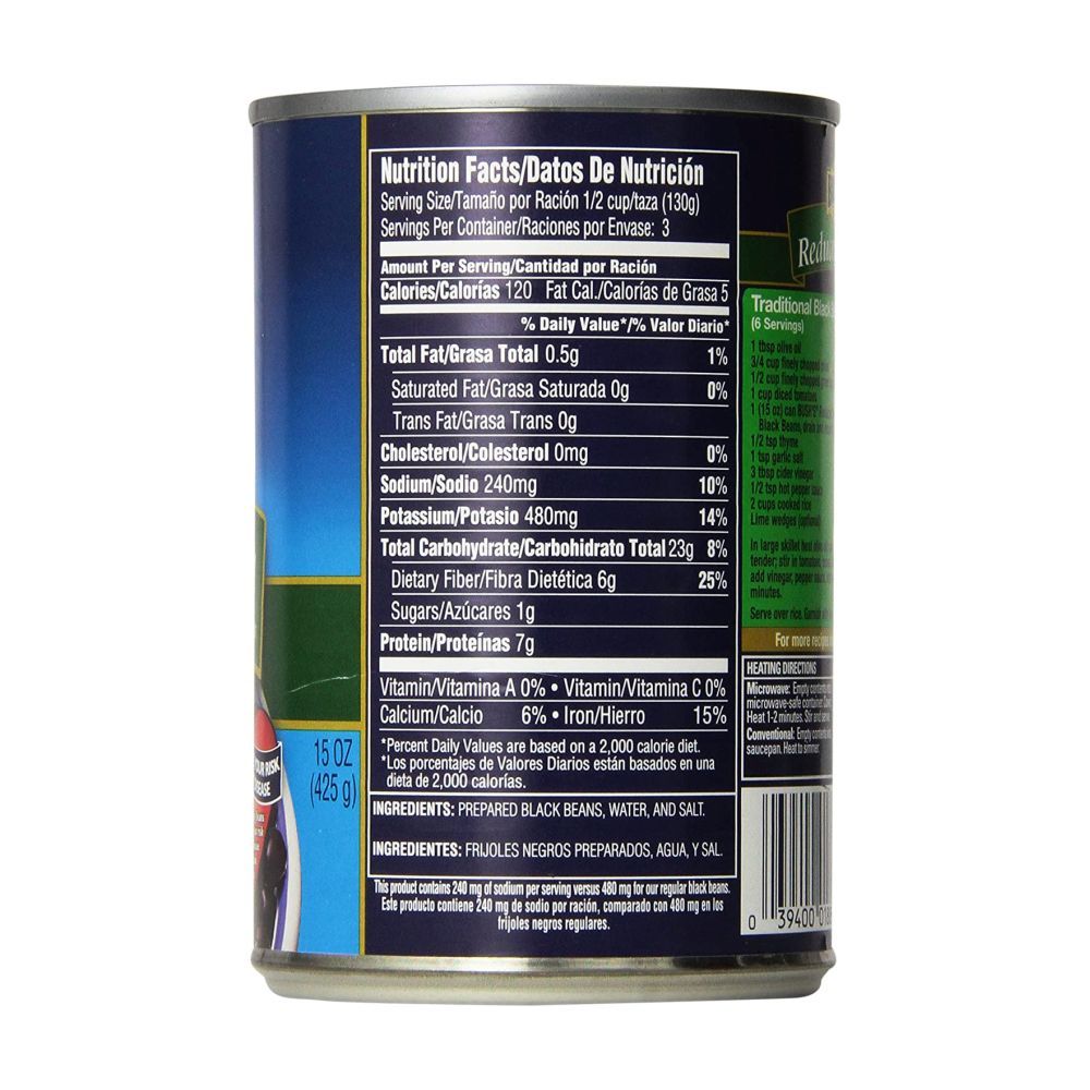 Bush's Best Bush's Black Beans 4-15 Oz Cans Nutrition Facts Bush's Best Bush's Black Beans 4-15 Oz Cans Nutrition Facts. Serving Size : 130g: Calories: 120 : Calories From Fat: 4 : Amount Per Serving % Daily Value* Total Fat: 0.494g : 1% : Saturated Fat: 0g : 0% : ... A serving of Bush's Best Bush's Black Beans 4-15 Oz Cans contains 3 Weight Watchers SmartPoints, 3 PointsPlus and 2 SmartPoints. ... Bush's organic black beans 15 oz by Bush Brothers & Company nutrition ... Bush's organic black beans 15 oz by Bush Brothers & Company contains 111 calories per 130 g ... Bush's black beans 4-15 oz cans by Bush Brothers & Company nutrition ... Ingredients. Bush's black beans 4-15 oz cans by Bush Brothers & Company contains 120 calories per 130 g serving. This serving contains 0.5 g of fat, 7 g of protein and 23 g of carbohydrate. The latter is 1 g sugar and 6 g of dietary fiber, the rest is complex carbohydrate. Bush's black beans 4-15 oz cans by Bush Brothers & Company contains 0 g ... Black Beans - Bush Reduced Sodium calories, carbs & nutrition facts ... Find calories, carbs, and nutritional contents for Black Beans - Bush Reduced Sodium and over 2,000,000 other foods at MyFitnessPal. Log In. Sign Up. About Food Exercise Apps Community Blog Premium. Black Beans Black Beans - Bush Reduced Sodium. Serving Size : 0.5 cup. 110 Cal. 74% 20g Carbs. 0%--Fat.