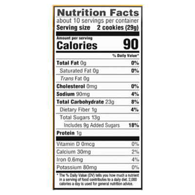 Nabisco Newtons Fig Newtons 7.0 oz - SmartLabel™ Nutrition Facts About 10 Servings Per container Serving Size 2 cookies (29g) Amount Per Serving Calories 100 % Daily Value * Total Fat 2 g 3.0% Saturated Fat 0 g 0.0% Trans Fat 0 g Cholesterol 0 mg 4.0% Sodium 95 mg 4.0% Total Carbohydrate 21 g 7.0% Dietary Fiber 1 g 4.0% Total Sugars 12 g Protein 1 g Calcium 2.0% Iron 4.0% Potassium 2.0%