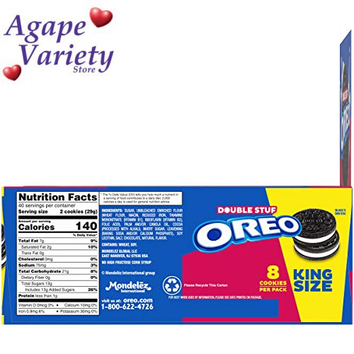 Nabisco Oreo Double Stuf Chocolate Sandwich Cookies Family Size Ingredients Sugar, Unbleached Enriched Flour (Wheat Flour, Niacin, Reduced Iron, Thiamine Mononitrate (Vitamin B1), Riboflavin (Vitamin B2), Folic Acid), Palm and/or Canola Oil Cocoa (Processed with Alkali), High Fructose Corn Syrup, Leavening (Baking Soda and/or Calcium Phosphate), Salt, Soy Lecithin, Chocolate, Artificial Flavor. Safety warning