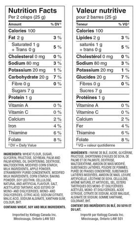 Special K* Strawberry Flavour Fruit Crisps - SmartLabel™ Special K* Strawberry Flavour Fruit Crisps. 125 g. 00064100498129. Nutrition . Ingredients . Allergens . Features & Benefits . Company, Brand & Sustainability . 100. Calories. 1 g. Saturated Fat. 80 mg. Sodium. 7 g. Sugar. Nutrition Facts. Per 1 pouch (25 g) Amount Per Serving; Calories 100 : Amount/Serving % Daily Value* Total Fat 2 g: 3 % ...