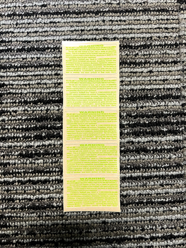 3" X 1-1/2" Warning Sticker | Healy Awards Price as low as $0.60 SKU 02-WS Need to replace a warning sticker for your football helmets? Order our high quality 20 mil vinyl warning decals to last you multiple seasons. Warning decals can be printed with the text and background in any of our standard print colors. Size: 3"W x 1-1/2"H Price per Decal (Minimum Order 50 Decals) Text Color