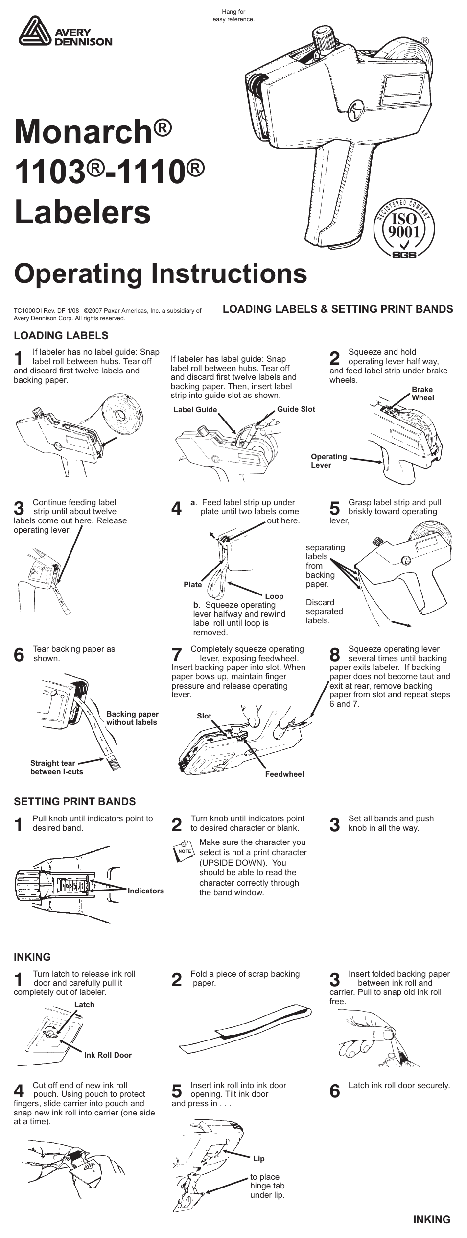 Paxar 1103, 1110 User Manual - ManualMachine.com Tear off and discard first twelve labels and backing paper. Then, insert label strip into guide slot as shown. Label Guide Guide Slot Squeeze and hold 2 operating lever half way, and feed label strip under brake wheels. Brake Wheel Operating Lever Continue feeding label 3 strip until about twelve labels come out here. Release operating lever. How to load a Monarch 1110 Price Gun - YouTube Monarch 1110 Price Gun, Loading, Adjusting, Change Ink Roller & OperationPlease visit our web site: out our prices. We s... Loading Instructions for Monarch 1110 Series Hand Labelers - Avery Dennison Loading Instructions for 1110 Series Hand Labelers. Watch now... Worldwide Avery Dennison Websites Change] Contact Us. Printer Solutions. North America ... Monarch ® 1110 Series Hand Labelers. Useful Links. Manuals and Status Codes Utilities and Firmware Service Agreements ...