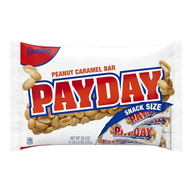 PAYDAY Peanut and Caramel Candy, Bulk Candy, 1.85 oz Bars (24 ct) Product Description. PAYDAY full-size peanut and caramel candy bars are many-bite versions of the PAYDAY treats you already know and love. This candy bar is made with crunchy peanuts and creamy caramel for a taste that's sweet, salty and undeniably satisfying. Peanut candy lovers are sure to enjoy this bulk box that keeps on giving.