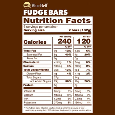 Nutrition Facts for Blue Bell Fudge Bars • MyFoodDiary® Blue Bell Fudge Bars Nutrition Facts Serving Size bars 2 bars = 132g Amount Per Serving 240 Calories % Daily Value* 14% Total Fat 9g 40% Saturated Fat 8g Trans Fat 0g 2% Cholesterol 5mg 4% Sodium 100mg 12% Total Carbohydrate 35g 4% Dietary Fiber 1g Total Sugars 27g 38% Includes 19g Added Sugars Protein 5g 0% Vitamin D 0mcg 15% Calcium 190mg