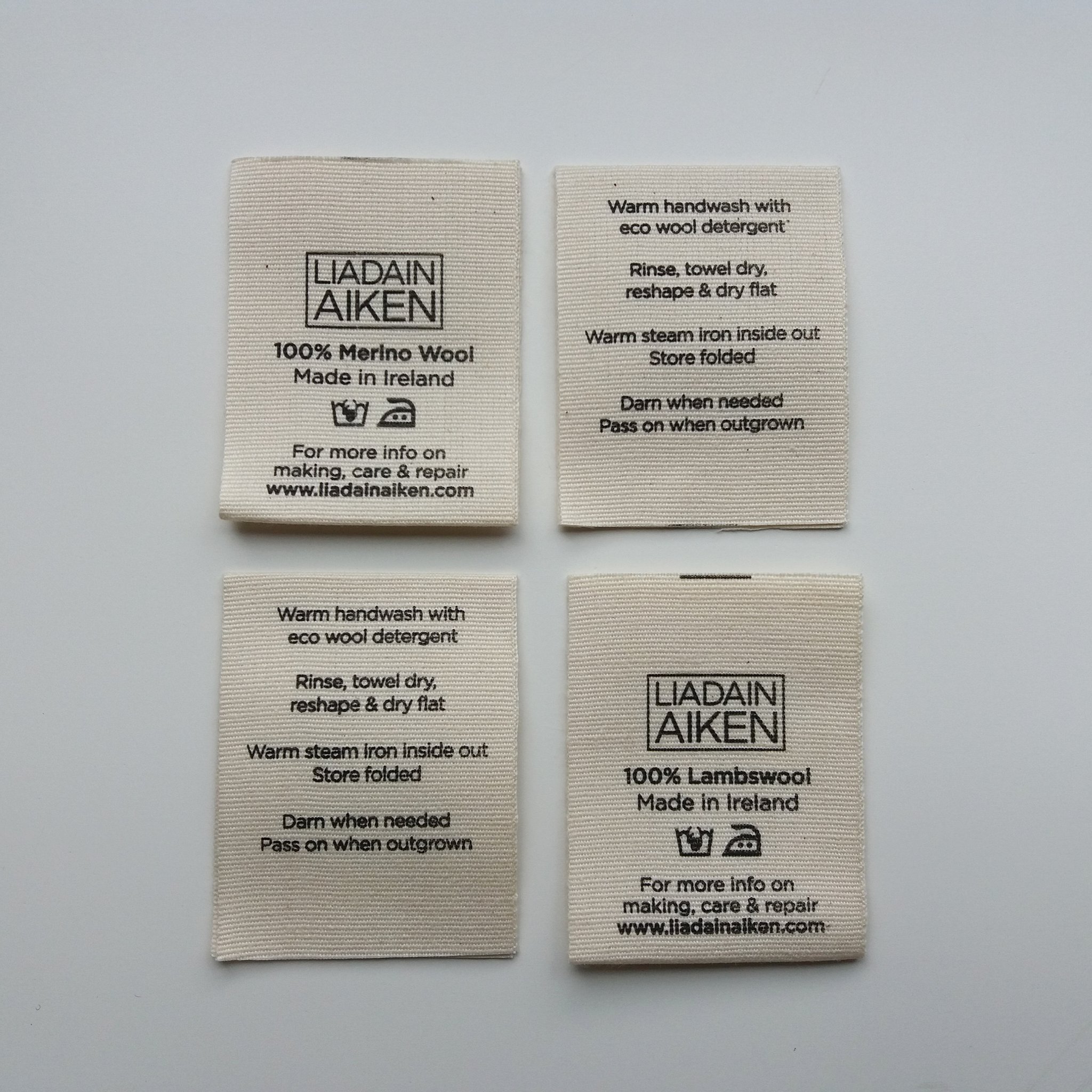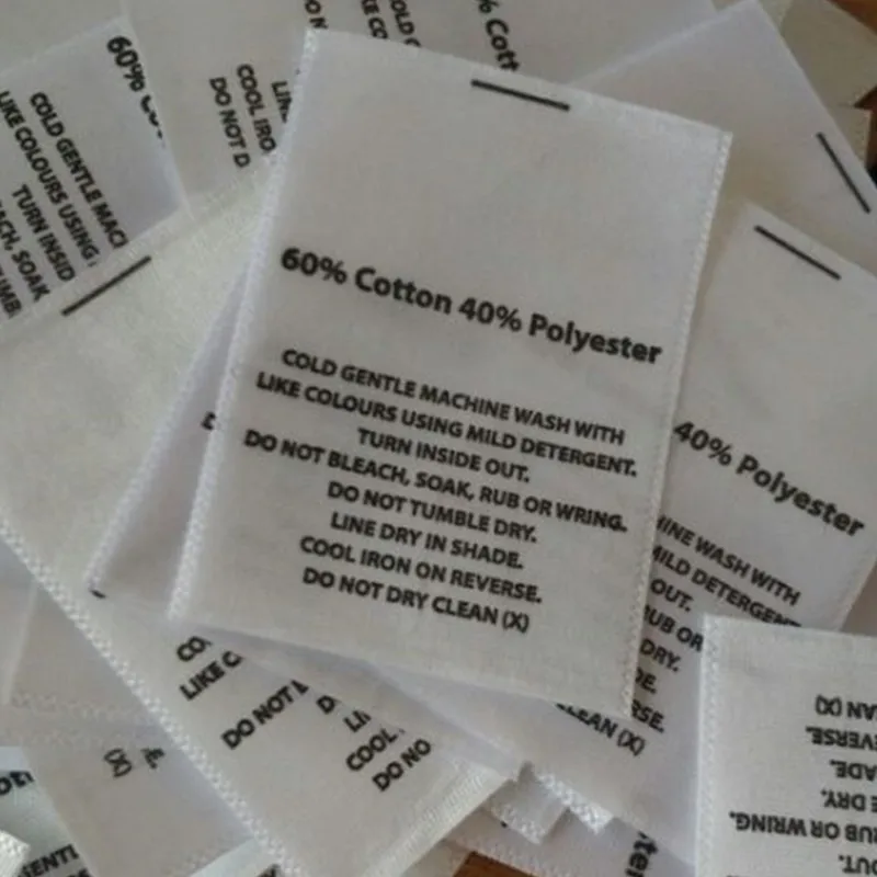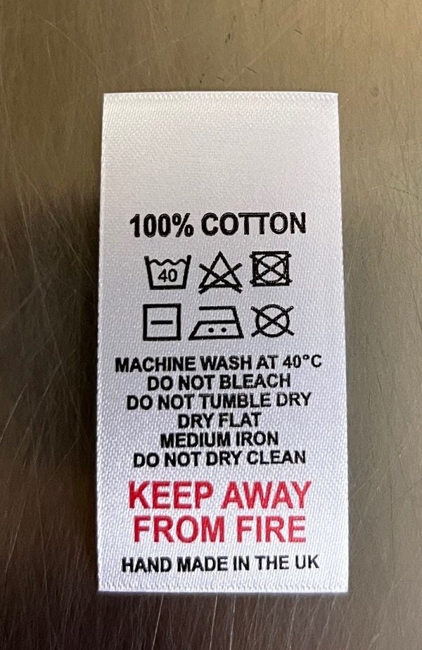 100% Cotton Wash Care Labels - Fabric Care Tags (Qty. 100) Text on Labels: 100% Cotton, Machine wash cold, Tumble dry low, No bleach, Cool iron only. This listing is for a set of 100 wash care labels. These clothing labels are made non-fray nylon and printed with permanent ink. LABEL SIZE: 1" x 1.25". COLOR OF MATERIAL: White COLOR OF TEXT: Black FONT: Calibri.