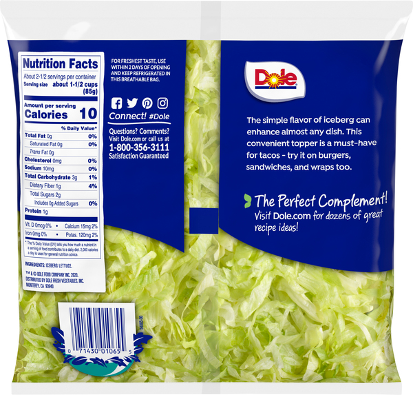 5 Interesting Types of Lettuce - Healthline Oct 10, 2019 · Lettuce (Lactuca sativa) is a popular leafy vegetable in the daisy family. It ranges in color from yellow to dark green but may also have reddish hues. Lettuce | Description, Varieties, & Facts | Britannica 23 déc. 2022 · lettuce, (Lactuca sativa), annual leaf vegetable of the aster family (Asteraceae). Most lettuce varieties are eaten fresh and are commonly served as the base of green salads. Lettuce is generally a rich source of vitamins K and A, though the nutritional quality varies, depending on the variety. Four botanical varieties of lettuce are cultivated: (1) celtuce, or … Iceberg Lettuce Nutrition Facts and Health Benefits - Verywell Fit Dec 15, 2022 ... One cup of shredded iceberg lettuce (72g) provides 69 calories, 0.6g of protein, 2g of carbohydrates, and 0.1g of fat. Iceberg lettuce is a ... Lettuce, iceberg (includes crisphead types), raw Nutrition Facts ... The good: This food is low in Sodium, and very low in Saturated Fat and Cholesterol. It is also a good source of Thiamin, Vitamin B6, Iron and Potassium, ...
