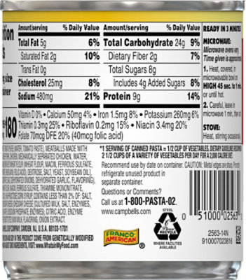 Amazon.com : SpaghettiOs Canned Pasta with Chicken Meatballs, Healthy ... One cup of SpaghettiOs canned pasta and chicken meatballs contains 1/2 cup of vegetables, as well as 12 grams of protein for a healthy snack or lunch you can feel good about. Break out this convenient canned food when you're craving tasty snacks, or prepare it as an entree for a fun kids lunch.