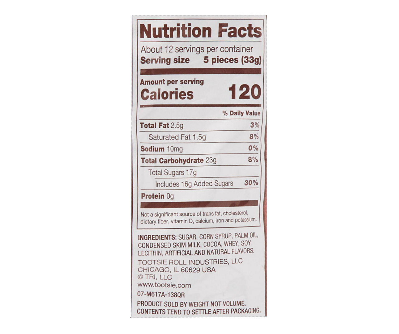 Tootsie Roll Midgees Candy - Hy-Vee Tootsie Roll Midgees are individually wrapped · Midgee Tootsie Rolls are only 11 calories per piece, and are Kosher, Gluten Free, and Peanut Free. Nutrition Facts for Tootsie Roll Small Midgees • MyFoodDiary® Tootsie Roll. Small Midgees. Nutrition Facts. Serving Size. pieces. Amount Per Serving. 130. Calories. % Daily Value*. Tootsie Roll, Midgees - Nutritionix Dec 11, 2018 ... Tootsie Roll, Midgees ; Serving Size: pieces (40g grams) ; Calories 140. Calories from Fat 30 ; 0%. Vitamin A ; 0%. Vitamin C ; 2%. Calcium.