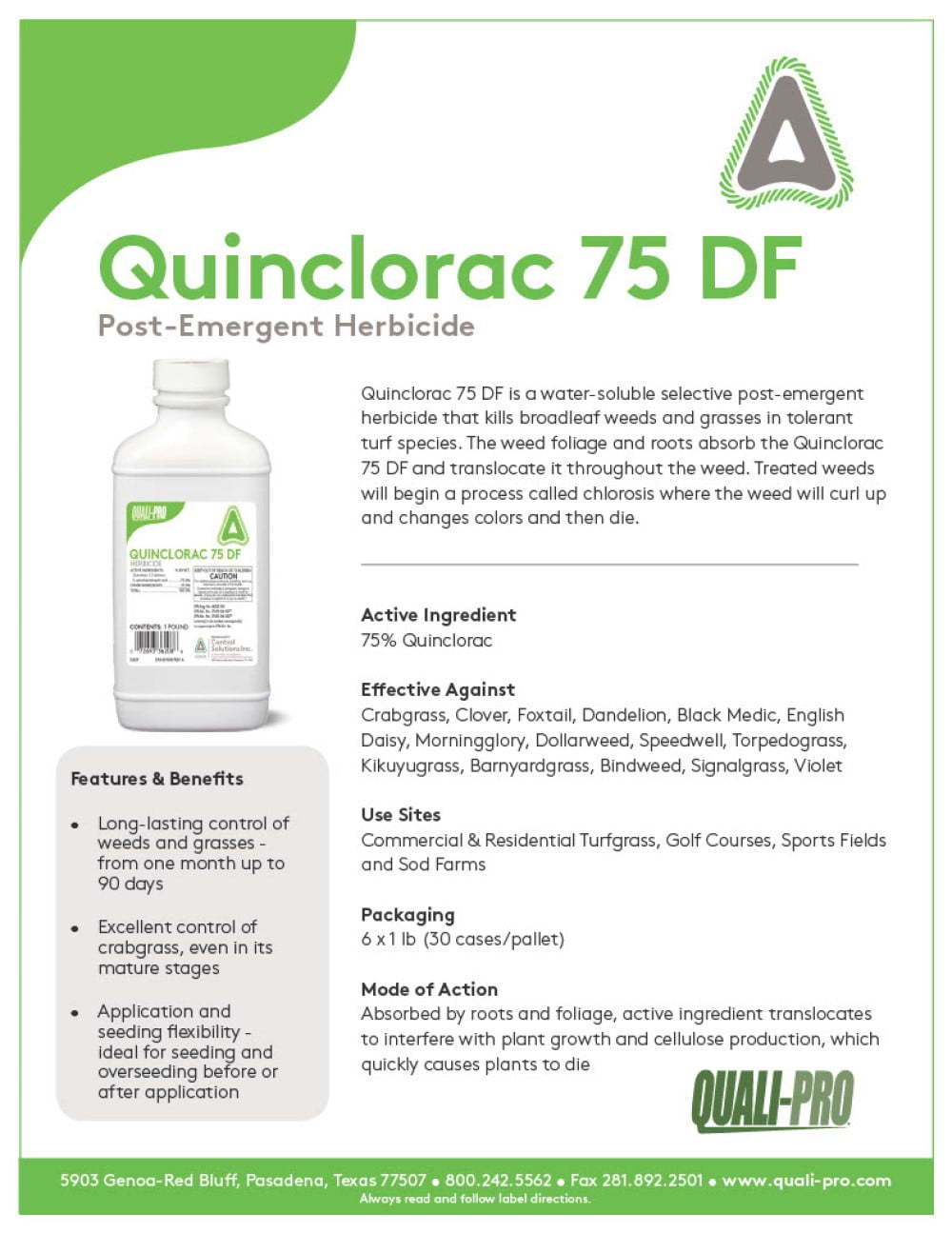 Quinclorac 75 DF Post Emergent Herbicide - 1 LB BTL - Reinders Product Label Download SDS. Dependable post-emergent control of both broadleaf and grassy weeds in a wide variety of turf species from residential and commercial to golf courses, sports fields, and sod farms. The weed foliage and roots absorb Quali-Pro Quinclorac 75 DF and translocate it throughout the weed.