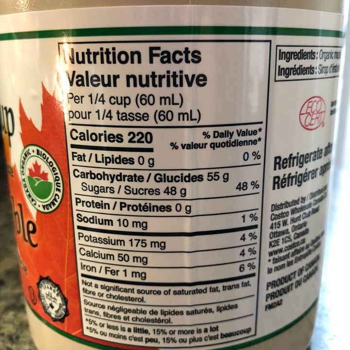 Kirkland Signature Maple Syrup, Organic - Fooducate Nutrition · Serving Size: 2 Tbsp (30mL) · Amount per Serving My Daily Value · Calories 110Kcal 6% · Total Fat 0g 0% · Saturated Fat 0g 0% · Trans Fat 0g 0%. Maple Syrup - Kirkland Signature - 1L (33.8 FL OZ) Nutrition facts ; Fiber, 0 g, 0 g ; Proteins, 0 g, 0 g ; Salt, 0.004 g, 0.003 g ; Calcium, 66.7 mg, 40 mg (4 % DV) ... Organic Maple Syrup Calories, Carbs & Nutrition Facts - MyFitnessPal Kirkland Organic Maple Syrup Serving Size: 0.25 cup 220 Cal 100% 54g Carbs 0% -- Fat 0% -- Protein Track macros, calories, and more with MyFitnessPal. Join for free! Daily Goals How does this food fit into your daily goals? Calorie Goal 1780 Cal 220/2000Cal left Fitness Goals: Heart Healthy Fat 67 g --/67g left Sodium 2290 mg 10/2300mg left Costco Kirkland Signature Maple Syrup Review - Costcuisine The maple syrup from Costco by Kirkland Signature is quite delicious! It has a slight hint of molasses flavor and hints of vanilla and caramel. The syrup is not overly woody tasting and tastes like genuine pure maple syrup. It’s super smooth with a bold maple flavor.. This Costco maple syrup tastes pretty much the same to me as the high quality, gl...